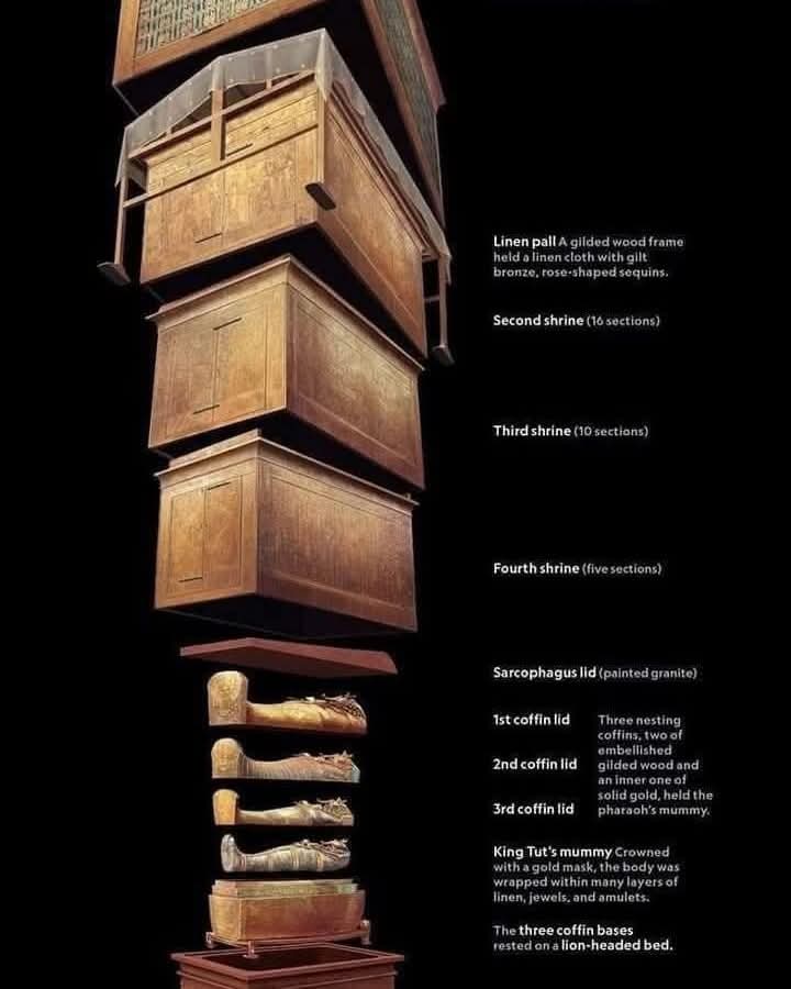 هل تعلم أن مومياء الملك توت عنخ آمون كانت محفوظة داخل 7 طبقات من الحماية، بينها 4 مقاصير خشبية مذهبة و3 توابيت متعاقبة آخرها من الذهب الخالص؟